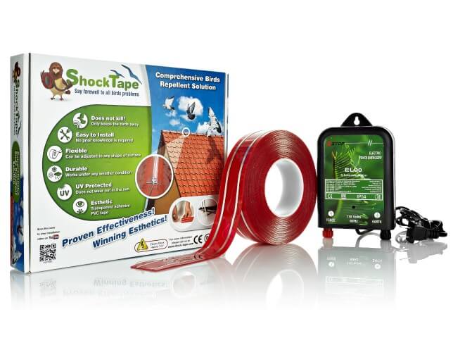 שוק טייפ, המערכת החשמלית שמבטיחה הרחקת יונים לצמיתות מגיעה בערכה שכוללת בתוכה: 10 מטרים של פס דבק שקוף, עליו מוטבעים שני פסי אלומיניום שדרכם עובר הזרם החשמלי, ספק כוח, 8 מטר כבל חשמל, 10 מחברים, מדבקות אזהרה, הוראות התקנה ובטיחות בשפה העברית, ומד זרם דיגיטלי. ההתקנה פשוטה ביותר וכול אחד יכול לעשות זאת בעצמו, בלבד שזה יהיה בטיחותי. את סרט ההדבקה הגמיש שנדבק לכל משטח ומתאים לכול מזג אוויר מדביקים במקום בו היונים נמצאות. (גגות רעפים, אדני חלונות, פרגולות, מעקות, מרפסות ועוד). ברגע שהיונה נוגעת בפס היא מקבלת זרם חשמלי חלש מאוד, שמבריח אותה מיד מהמקום, ויוצר אצלה דחייה לשוב בחזרה לאותו המקום. המערכת הינה אסתטית, ובעיקר הומנית, ואינה פוגעת בשום צורה ביונה ובבעל הכנף. המערכת הוכחה כ – 100% יעילה בפתרון הבעיה, והיא מרחיקה את היונים לצמיתות.